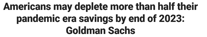 高盛集团估测,截至今年1月中旬,美国民众已花掉新冠疫情期间储蓄的35%;到今年底,剩下65%的储蓄也可能被耗尽。