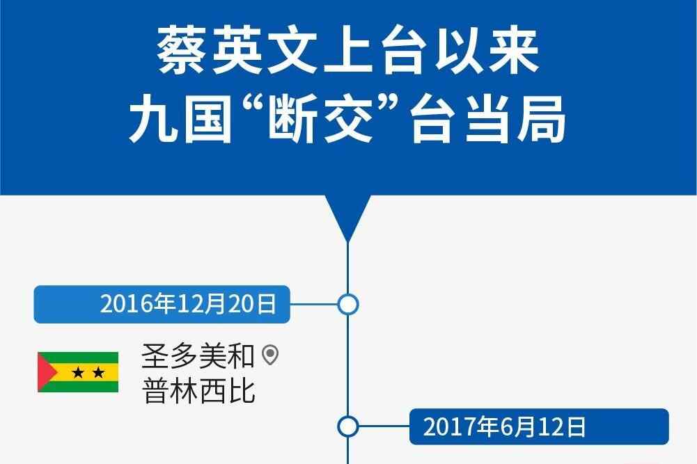 自2016年蔡英文上台以来,已陆续有9个国家与台湾当局断绝“外交关系”,分别是:圣多美和普林西比(2016年)、巴拿马(2017年)、多米尼加(2018年)、布基纳法索(2018年)、萨尔瓦多(2018年)、所罗门群岛(2019年)、基里巴斯(2019年)、尼加拉瓜(2021年)、洪都拉斯(2023年)。