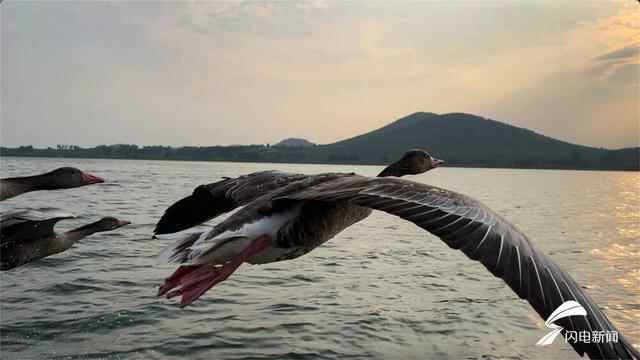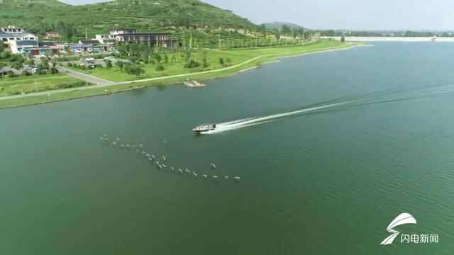 近日,山东临沂,大雁列队与快艇齐飞,任由游客抚摸。一只大雁停在游客手上,犹如静止一般。据介绍,这些大雁的品种是灰雁,从孵化开始训练,学飞的时候就会带到快艇旁训练,所以能伴飞也不怕人。