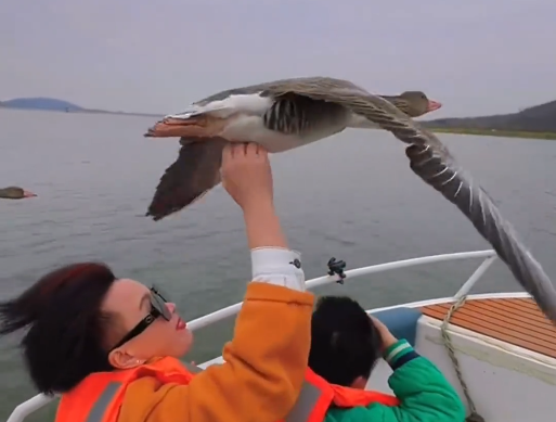 万物有灵,大雁与快艇齐飞任由游客抚摸