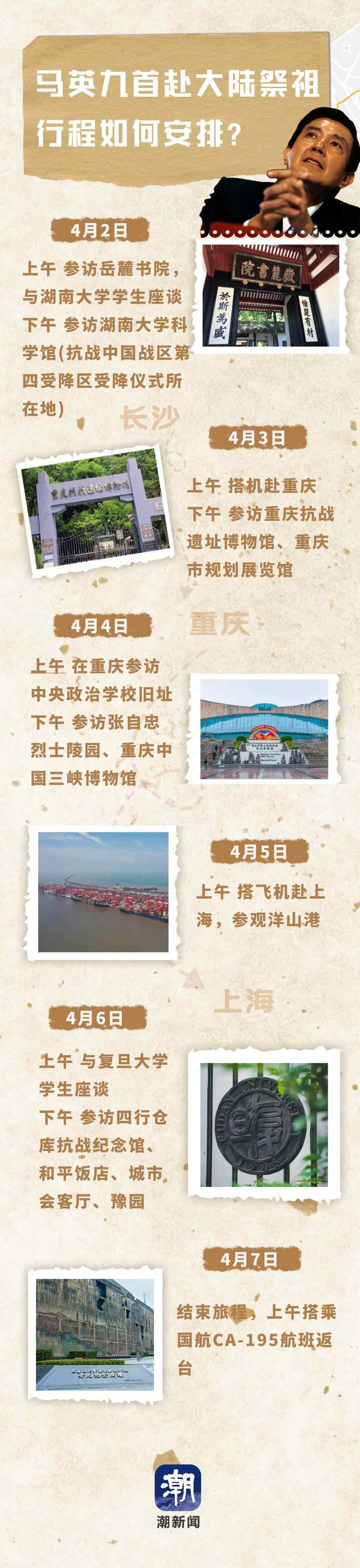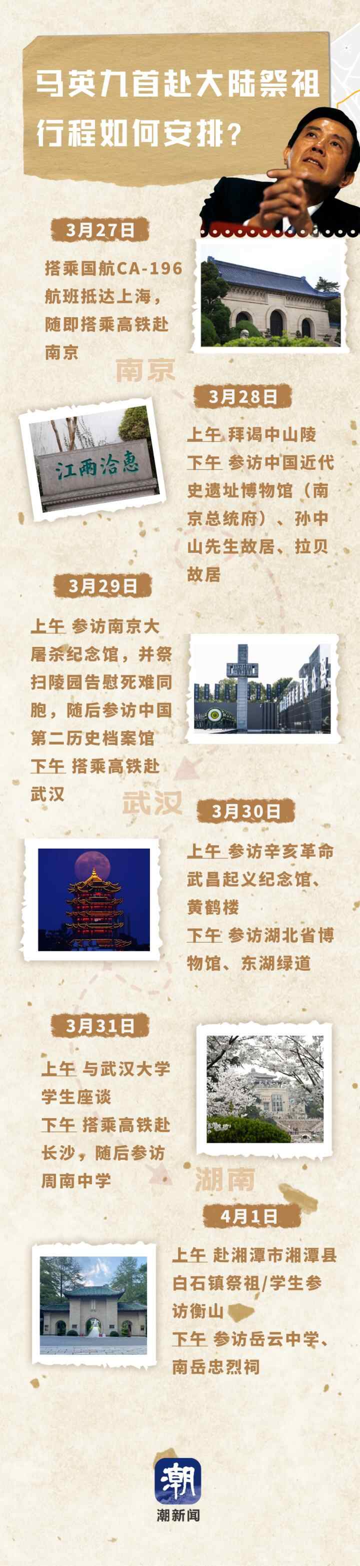 3月27日至4月7日,马英九将赴大陆祭祖,并率领30多位青年学子与大陆学生交流,预计将到访南京、武汉、长沙、重庆、上海等城市。台媒称,这是74年来首次有台湾地区领导人卸任后访问大陆。这12天的行程都有什么安排?