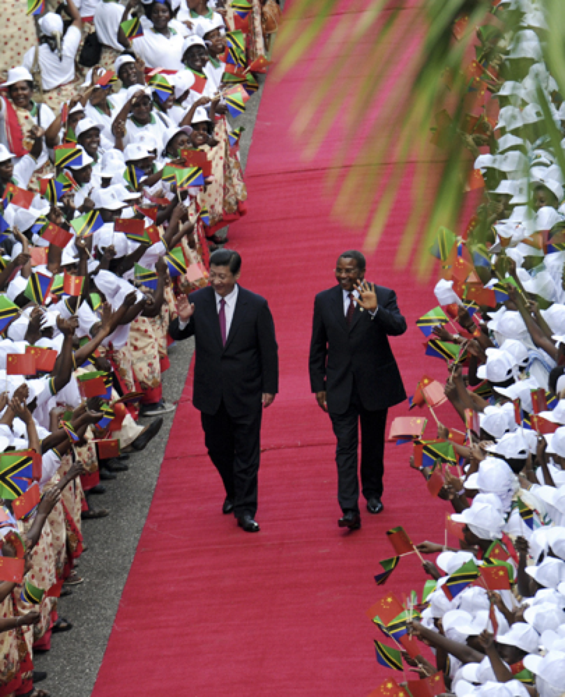 2013年3月24日,国家主席习近平在达累斯萨拉姆同坦桑尼亚前总统基奎特举行会谈。习近平和基奎特步入总统府时受到群众夹道欢迎。新华社记者 张铎 摄