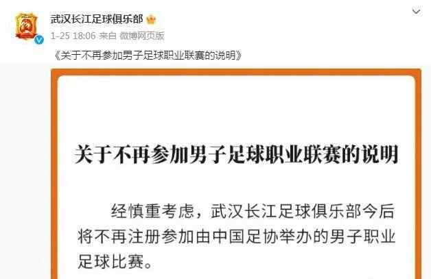 早在今年1月25日,降入中甲的武汉长江队就曾发布《关于不再参加男子足球职业联赛的说明》,拉开中国足坛一年一度的“退出大幕”。