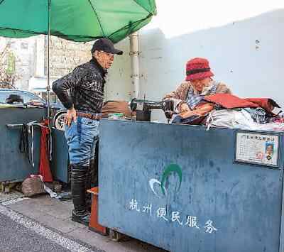 浙江省杭州市让“小修小补”的便民店铺规范有序回归百姓生活。图为西湖区北山街道便民服务摊位,裁缝师(右)为社区居民修补衣物。 新华社记者 江 汉摄