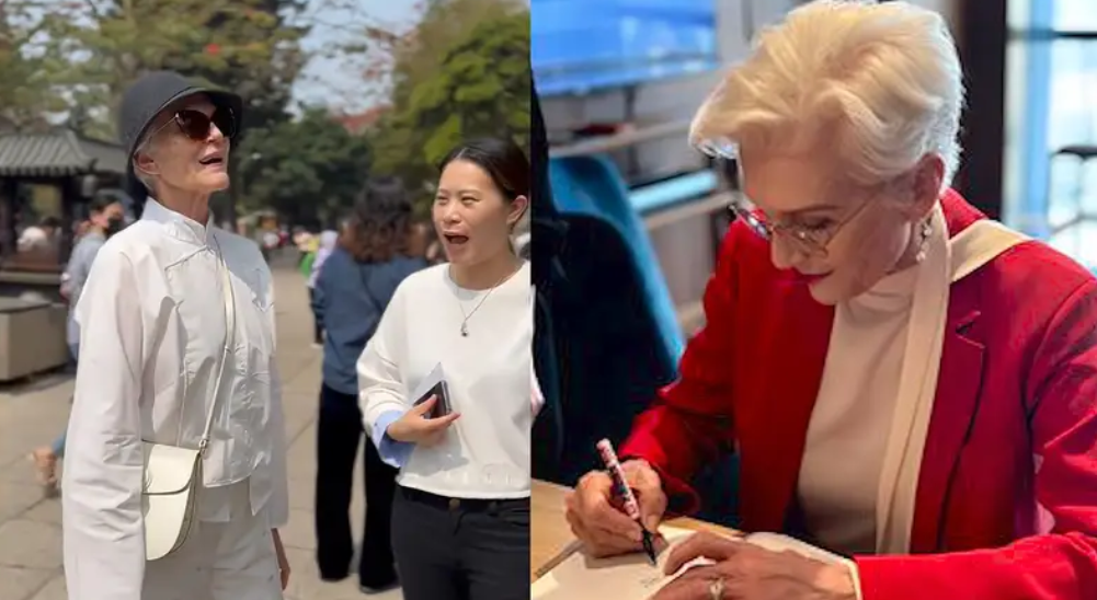 一篇新推文显示她身在苏州,身穿中国品牌鄂尔多斯的奶油色西服套装。