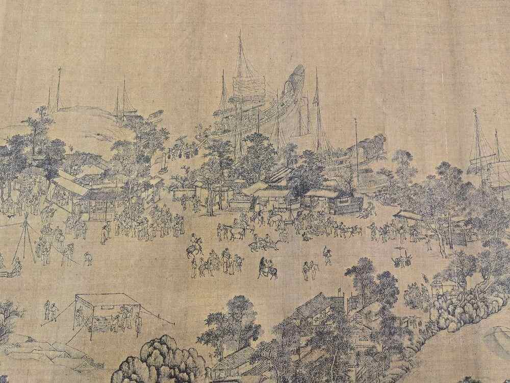 元代画作《江山胜览图卷》(局部,影印件)展现的温州朔门港口的繁华场景(2023年2月23日翻拍)。新华社记者 王俊禄 摄