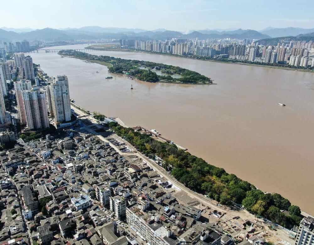 温州朔门古港遗址和江心屿遥遥相望(2022年10月10日摄,无人机照片)。新华社记者 翁忻旸 摄