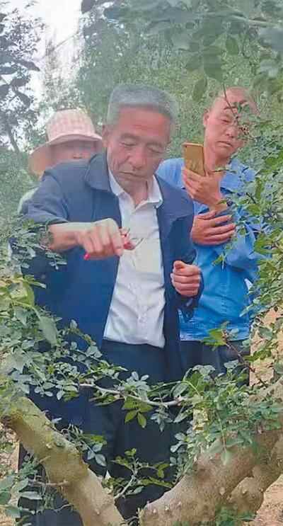 甘肃省秦安县农业技术推广研究员靳志强(中)向农民传授剪枝技术。潘虎林摄