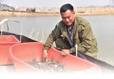 吉林省前郭尔罗斯蒙古族自治县高级农技师刘双在补充蟹苗。王国彬摄