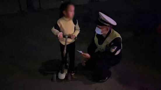 2月22日22时45分许,增城交警大队民警与辅警在朱村街处理完一宗警情归队途中,发现一个年龄约五六岁的小女孩踩着滑板车,独自一人沿着广汕路走。此时已是深夜,该路段灯光较暗,过往车辆行驶速度快,小女孩独行存在很大的安全隐患。