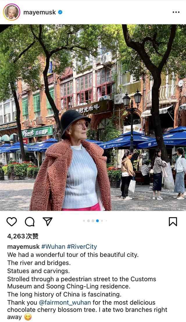 近日,世界首富、特斯拉创始人马斯克74岁的母亲梅耶·马斯克来中国了。梅耶在中国的第一站是广州,还去了厦门、成都、苏州,随后她来到了武汉。