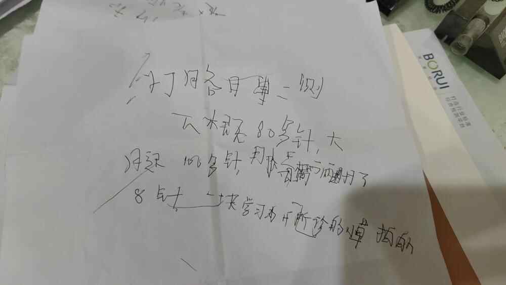 “打胳膊两侧,大概80多针,大腿100多针,小腿8针……”在一张白纸上,几行歪歪扭扭的黑色手写字体,是王华被送进ICU前留给丈夫蒋先生的。