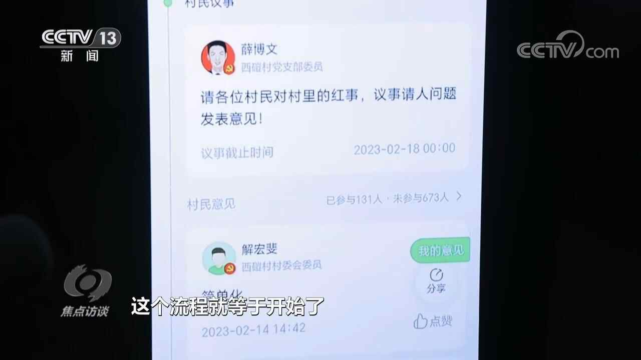 这是西磑村一起由村民在网上发起的“村民说事”,议事全程在一个名叫“村级事务管理平台”的微信小程序上办理,只用了5天的时间,红事前议事不摆宴席就形成了决议,写进了西磑村的《村规民约》。