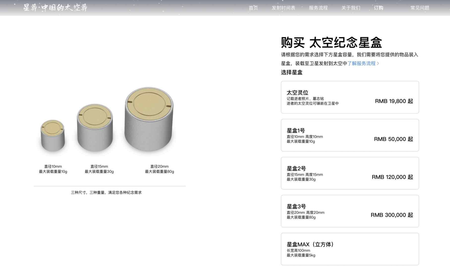 其官网显示,售价上,实物太空葬“太空纪念星盒”根据尺寸不同,定价不一,分别有直径高度10mm、15mm和30mm3种尺寸,最大装载重量在10g至80g不等,价格从低到高分别为5万元起、12万元起、30万元起。最便宜的是记载逝者照片、墓志铭的“太空灵位”,镶嵌在卫星中,售价为1.98万元起。