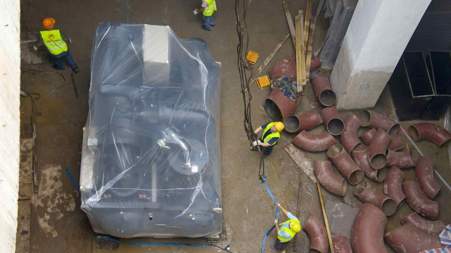 进场前,项目部提前部署施工计划。“2台双工况离心式冷水机组、1台基载变频离心冷水机组、45台蓄冰盘管、13台水泵、2台板式换热器总重量达230吨,为了把这些‘大家伙们’运送到负一层,我们针对危险源分析评估及预防控制措施编制了专项吊装方案,对起重设备的吊索具、现场地基承载力、托架及安全路线进行反复检测,最后,仅用了2天便顺利吊装完成。”项目经理谢胤昆说。