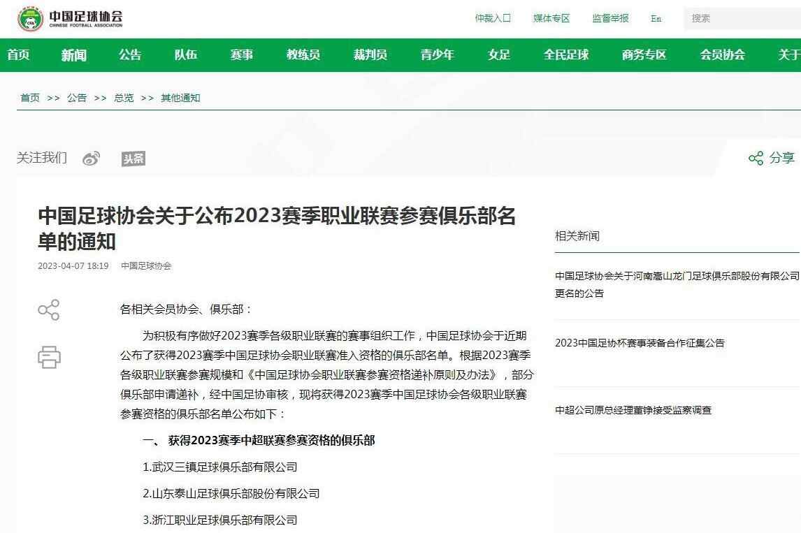 中国足球协会关于公布2023赛季职业联赛参赛俱乐部名单的通知
