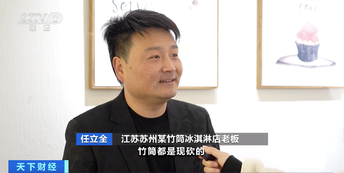 江苏苏州某竹筒冰激凌店老板 任立全:竹筒是在山上现砍的,一个竹筒6元,加运输费将近8元一个,所以成本相对会高一点。