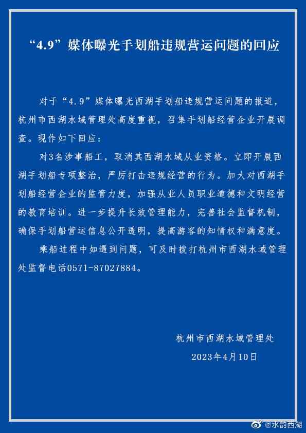 对于“4.9”媒体曝光西湖手划船违规营运问题的报道,杭州西湖水域管理处高度重视,召集手划船经营企业开展调查。现作如下回应: