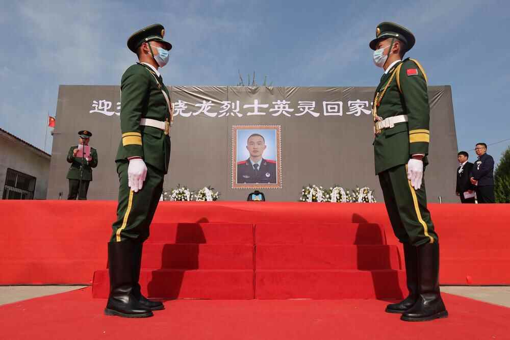4月10日上午,安徽省阜阳市太和县万寿山烈士纪念碑广场庄严肃穆,汪晓龙烈士骨灰安葬仪式在这里举行。在壮丽的《思念曲》中,一名礼兵手捧烈士遗像,另一名礼兵手捧覆盖着国旗的烈士骨灰盒,缓缓步入广场,放置在悼念台上,两侧的挽联写着“此去忠魂化碧涛 精神永留天地间”。