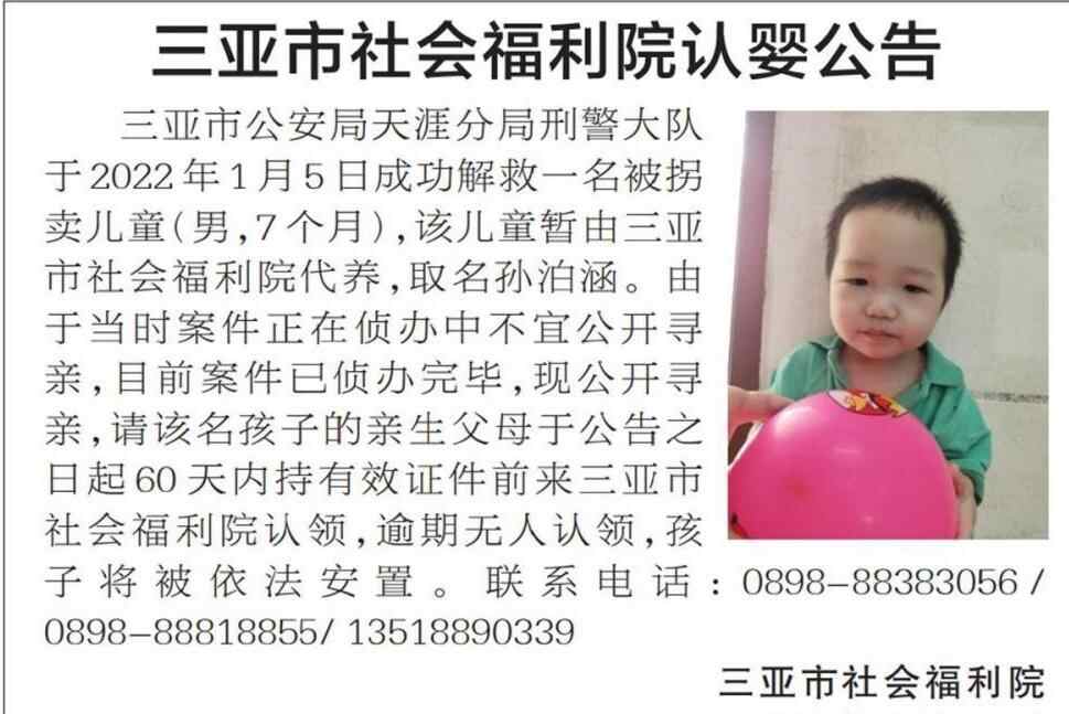 4月11日,三亚市社会福利院发布“认婴公告”,公布了7名获救被拐儿童的名单和照片,为他们寻亲。这7名孩子均是被三亚市公安局天涯分局刑警大队在不到一年内解救,被解救时,5人仅为7个月到1岁6个月的婴儿。