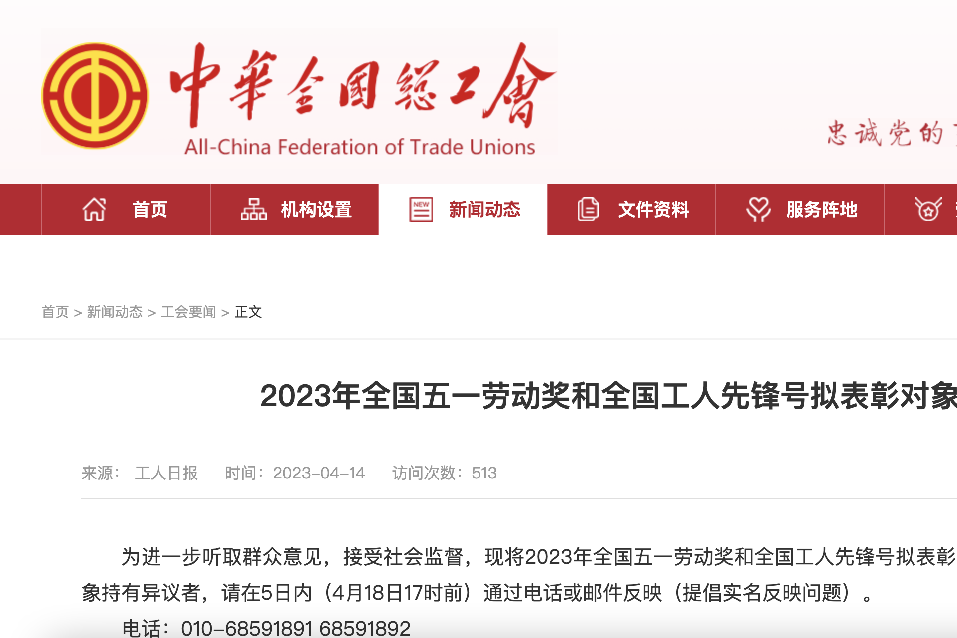 为进一步听取群众意见,接受社会监督,现将2023年全国五一劳动奖和全国工人先锋号拟表彰对象予以公示。凡对公示对象持有异议者,请在5日内(4月18日17时前)通过电话或邮件反映(提倡实名反映问题)。
