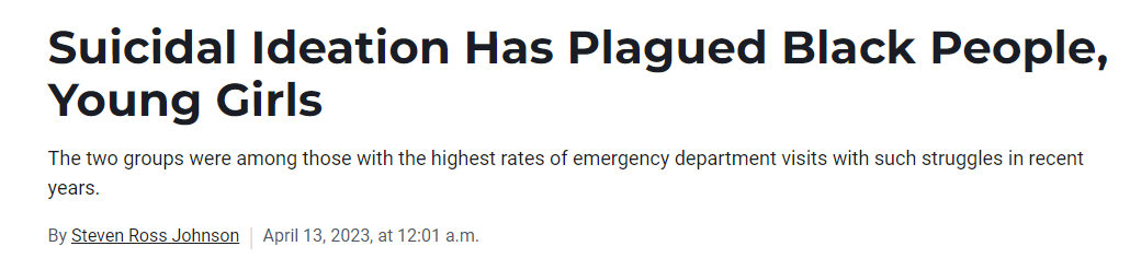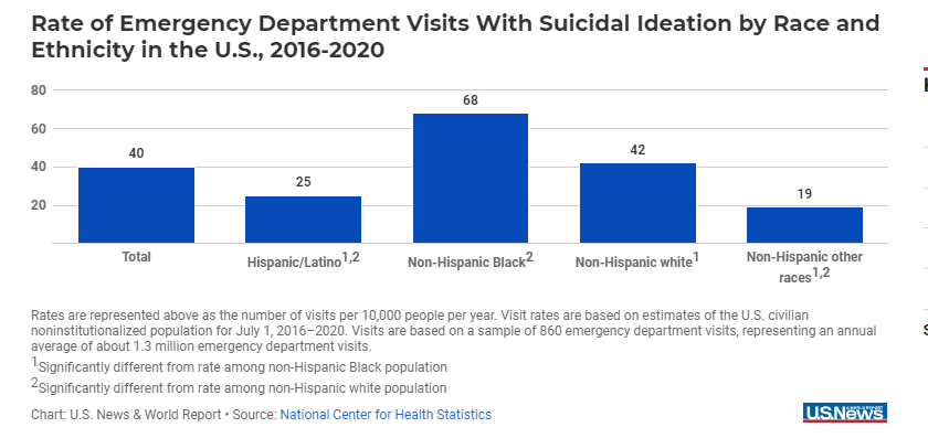 美国疾病控制与预防中心(CDC)下属国家卫生统计中心(National Center for Health statistics)最新报告显示,从2016年到2020年,每10000人便有40人因曾经考虑过或计划过自杀而去急诊科求诊。其研究结果表明,在所研究的种族和民族群体中,黑人的自杀倾向年平均就诊率最高,每1万人中有68人。相比之下,白人每1万人中有42人就诊,西班牙裔或拉丁裔每1万人中有25人就诊。根据这项研究,在其他非西班牙裔种族群体中,每1万人中有19人就诊。