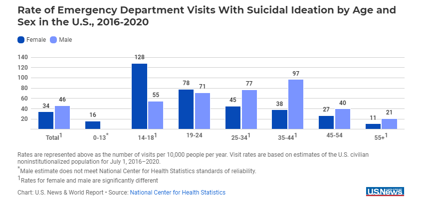 从年龄上看,14岁至18岁的年轻人平均每10,000人中有91人因自杀倾向前往急诊室就诊。在按年龄和性别进行调查时,这个年龄段的女孩的就医率最高,每年每万人中有128人就医。在年龄较大的女性群体中,这一比例有所下降。
