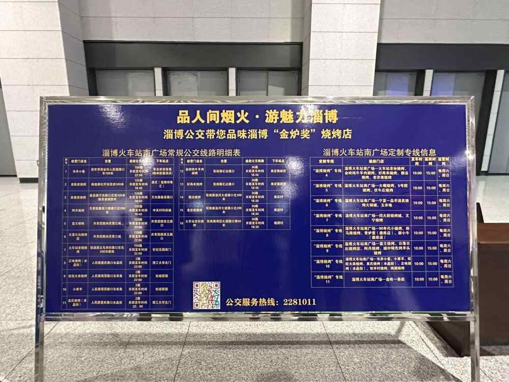 淄博火车站出站口的公交线路指示牌,清晰标明了各线路沿途知名烧烤店。(新华社记者 张超帆摄)