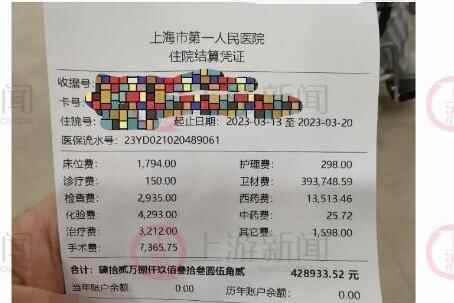 近日,一张病人在上海市第一人民医院“8天花费42万元”的住院结算凭证图片和相关文字在网络流传,引发关注和网友热议。