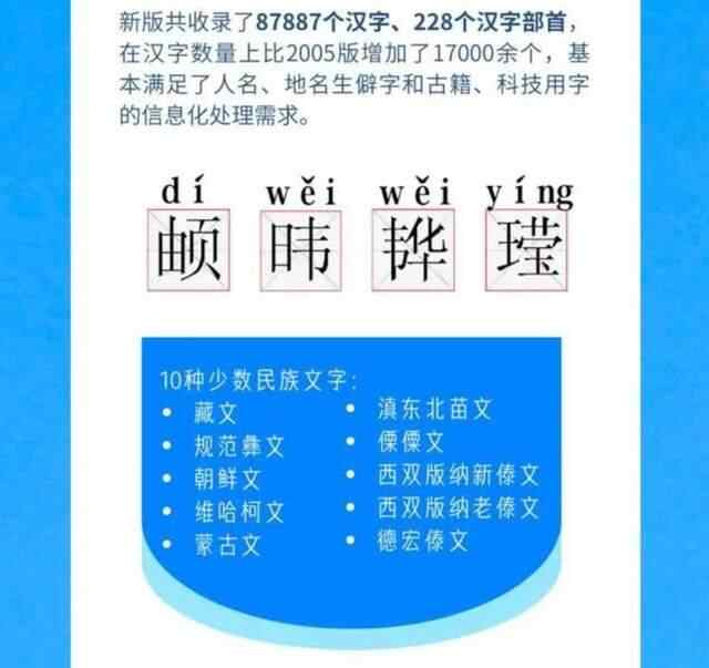 2022年7月,国家标准化管理委员会、工业和信息化部、国家语言文字工作委员会联合发布新版《信息技术 中文编码字符集》强制性标准(GB 18030-2022),新增1.7万余个生僻字,覆盖我国绝大部分人名、地名以及文献、科技等专业领域生僻用字。这个标准将于今年8月1日正式实施,从当日起,政务服务和公共服务的产品与系统都必须支持标准内87887个汉字。
