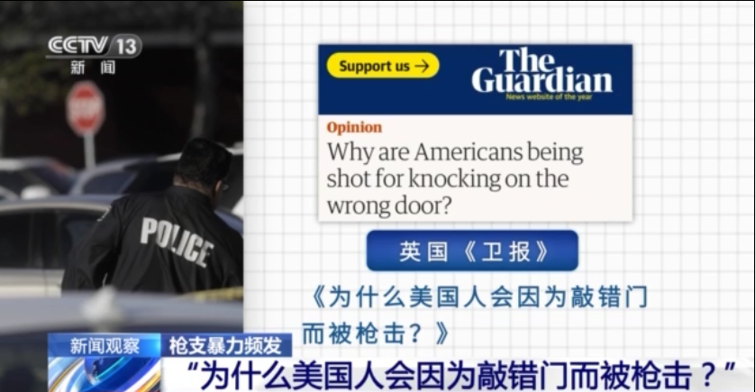 枪支暴力是美国的“瘟疫”,如今更是变本加厉。英国《卫报》当地时间19日发表题为《为什么美国人会因为敲错门而被枪击?》的文章指出,很难想象类似事件在其他国家发生,只有美国人才会担心因为敲错门或者上错车而遭到枪击。文章指出,“枪支暴力的增加让所有人都紧张不安。冲动、暴躁、动辄开枪的愤怒情绪上升,加剧了恐惧和偏执,让人们警惕地注视着同行的乘客和顾客。” 与此同时,美国多重其他社会问题也加剧了枪支暴力。文章表示,“当愤怒情绪与种族主义、性别歧视和一系列其他仇恨原因相互作用时,将变得更加有害”。