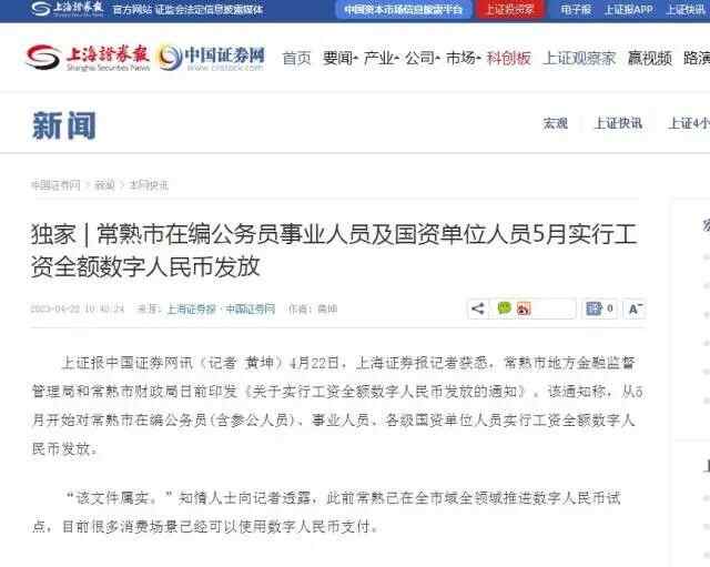 4月22日,据媒体报道,江苏省常熟市地方金融监督管理局和常熟市财政局日前印发《关于实行工资全额数字人民币发放的通知》。该通知称,从5月开始对常熟市在编公务员(含参公人员)、事业人员、各级国资单位人员实行工资全额数字人民币发放。