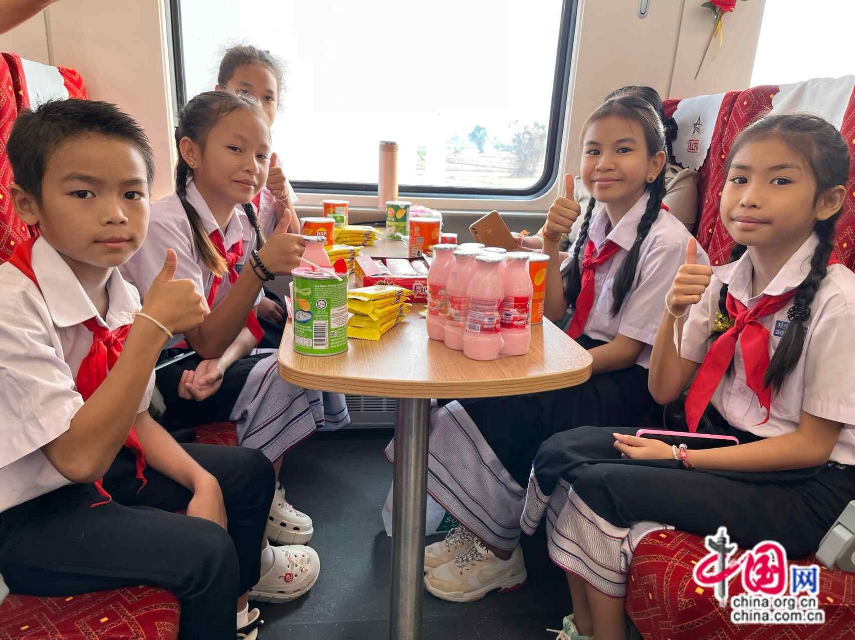4月17日上午,老挝中老友好农冰村小学师生来到万象站,体验乘坐中老铁路澜沧号动车组列车。中国网记者 唐佳蕾/摄