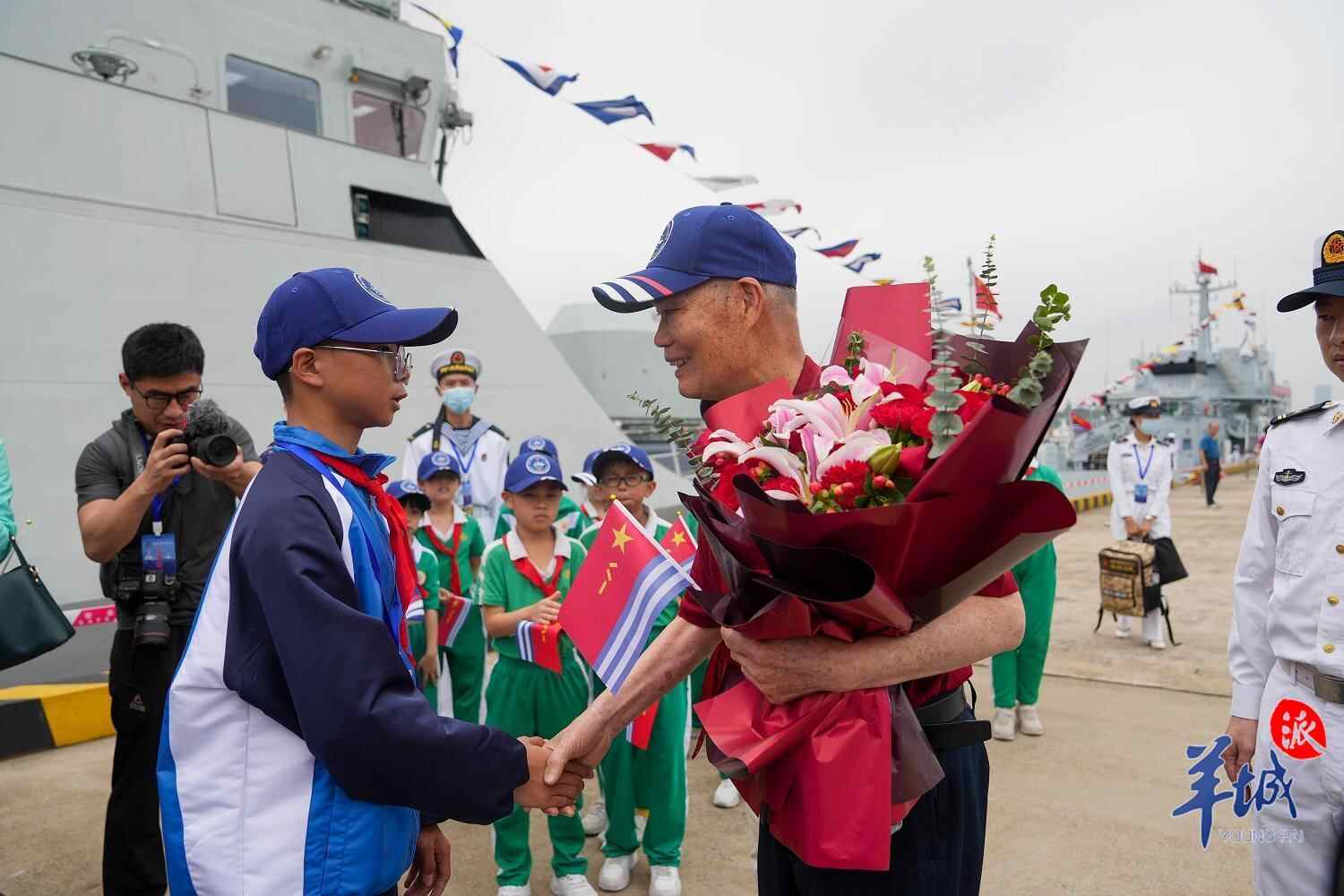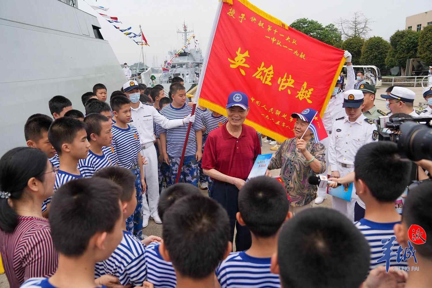 12名师生代表跨越2000余公里,来到广州参加海军舰艇开放活动,小学生们穿着整齐的校服,为海战老英雄麦贤得献上鲜花,聆听老英雄“听党话、跟党走”的谆谆教诲。