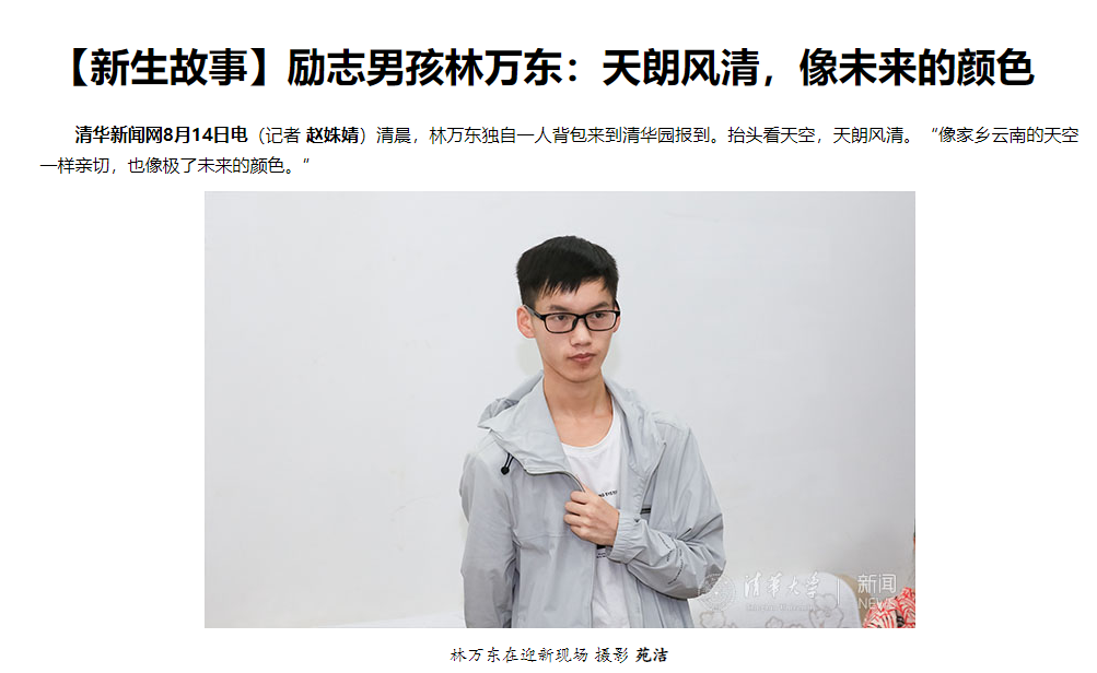 邱勇在清华大学2019级本科生新生开学典礼上提到,来自云南、坚信“唯有自强不息,才有日后无限可能”的林万东同学,通过自己的努力成为清华大家庭的一员。