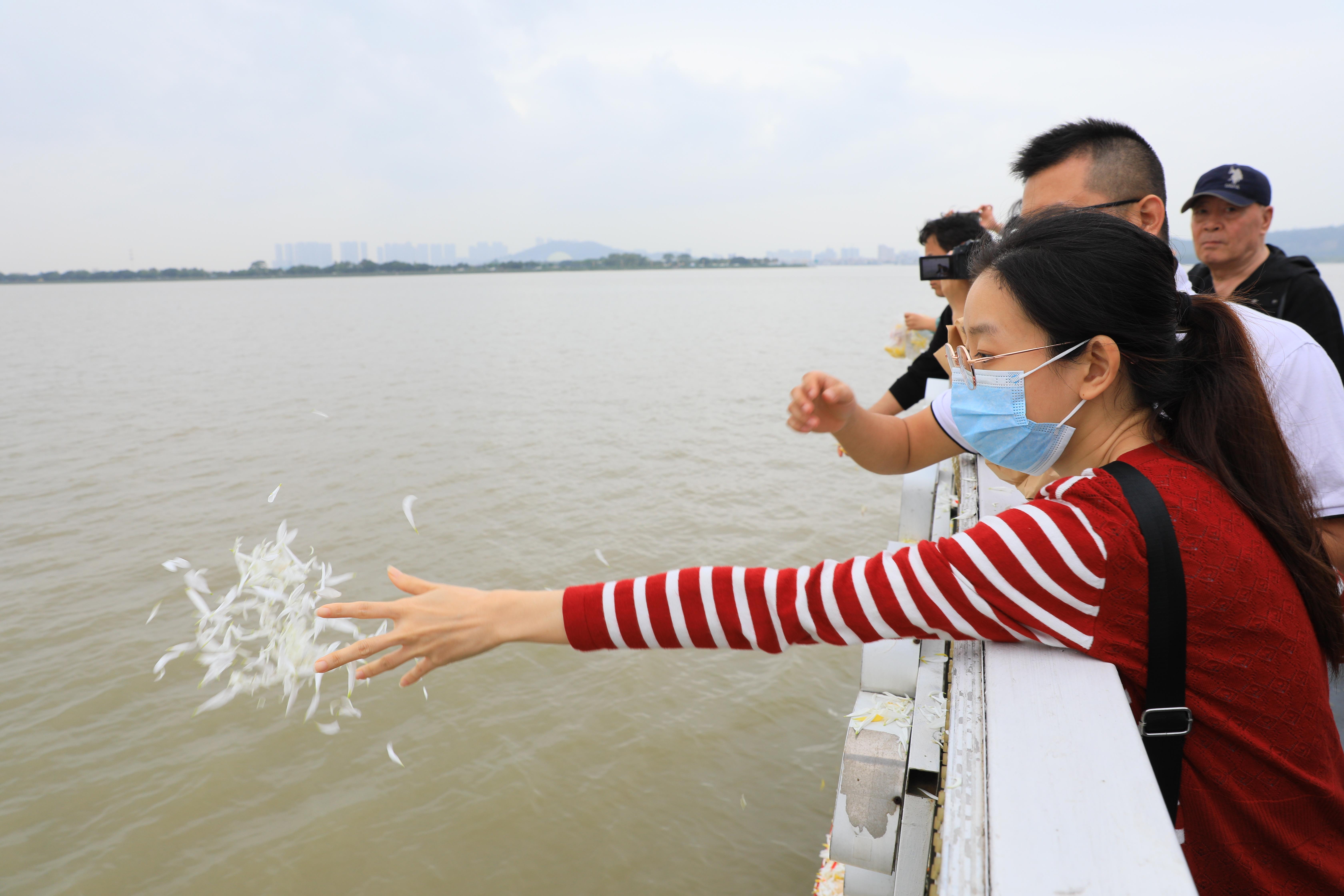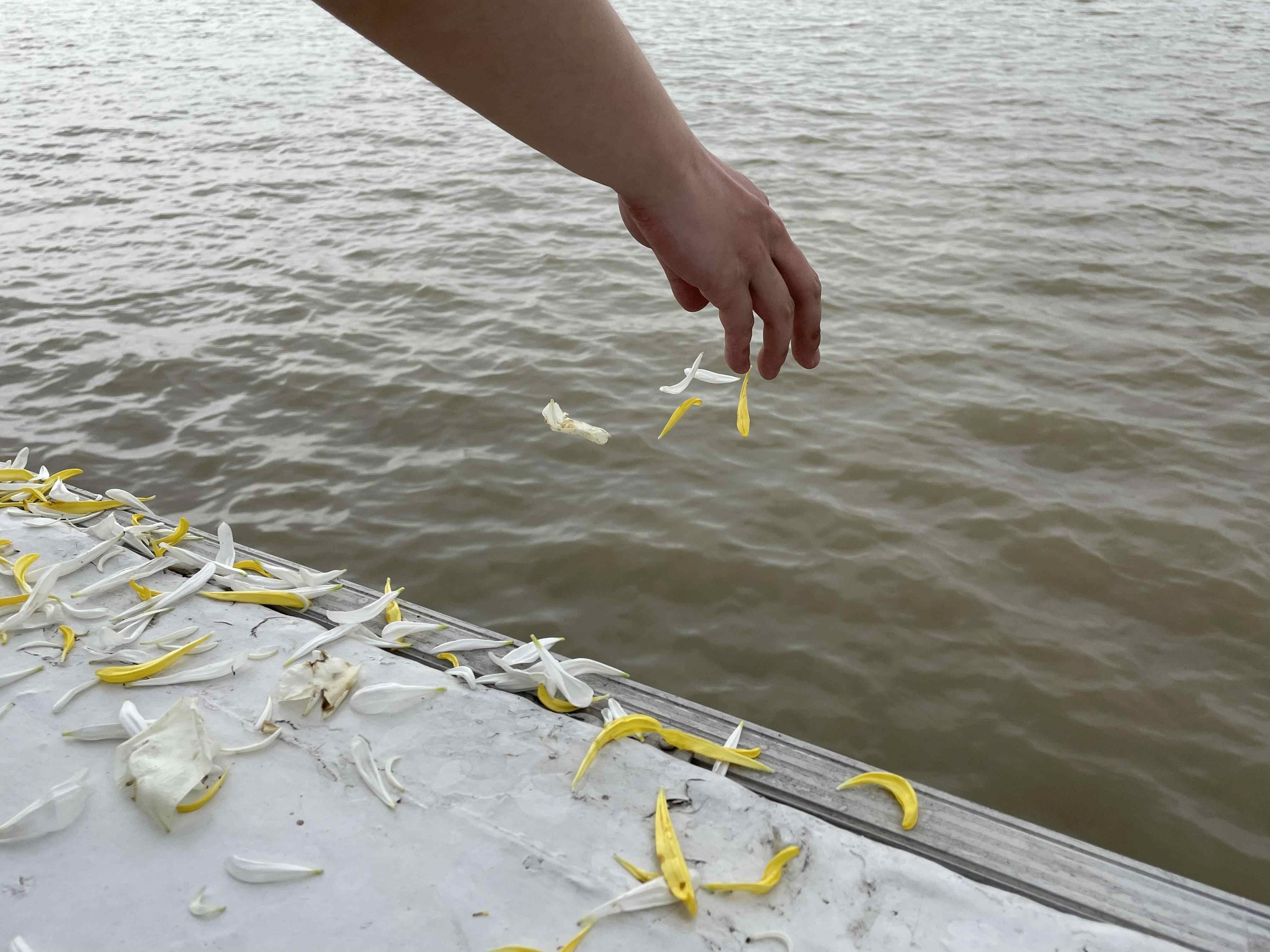 当船速渐缓,送别船上举行了仪式,缅怀为殡葬改革和节地生态安葬作出积极探索的逝者。随后,市民们将象征着思念的鲜花一瓣一瓣地撒向大海。礼毕,船只缓缓掉头,市民的目光追随着江面漂浮的花瓣,从船头走到船尾。返航路上,雨雾蒙蒙,那片海域在浓雾中渐渐隐去,团团浓雾仿佛替满船人定格哀思,雨水就是船上人思念的泪水。