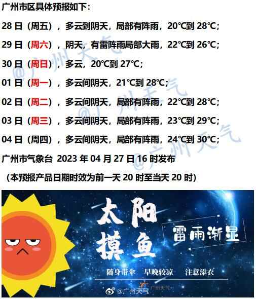 28日白天,粤西、珠江三角洲西部市县、清远和韶关多云到阴天,有分散(雷)阵雨,其余市县多云为主,局部有(雷)阵雨,中西部市县早晚有(轻)雾。