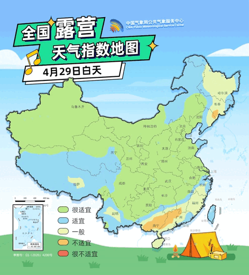 【白天】4月29日,东北南部、华南中西部,5月2日新疆东北部、西藏东部、江南中西部、江淮及重庆东南部、广西北部等地部分地区,5月3日江南北部、江淮南部等地将相继出现不适宜或很不适宜的露营气象等级。