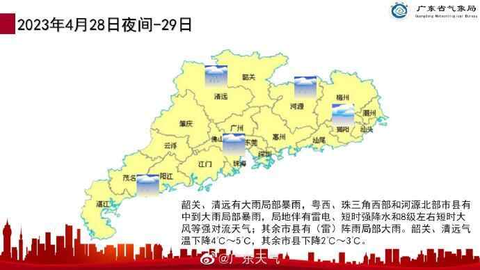 28日夜间-29日,弱冷空气影响,韶关、清远有大雨局部暴雨,粤西、珠江三角洲西部和河源北部市县有中到大雨局部暴雨,局地伴有雷电、短时强降水和8级左右短时大风等强对流天气;其余市县有(雷)阵雨局部大雨。韶关、清远气温下降4℃~5℃,其余市县下降2℃~3℃。