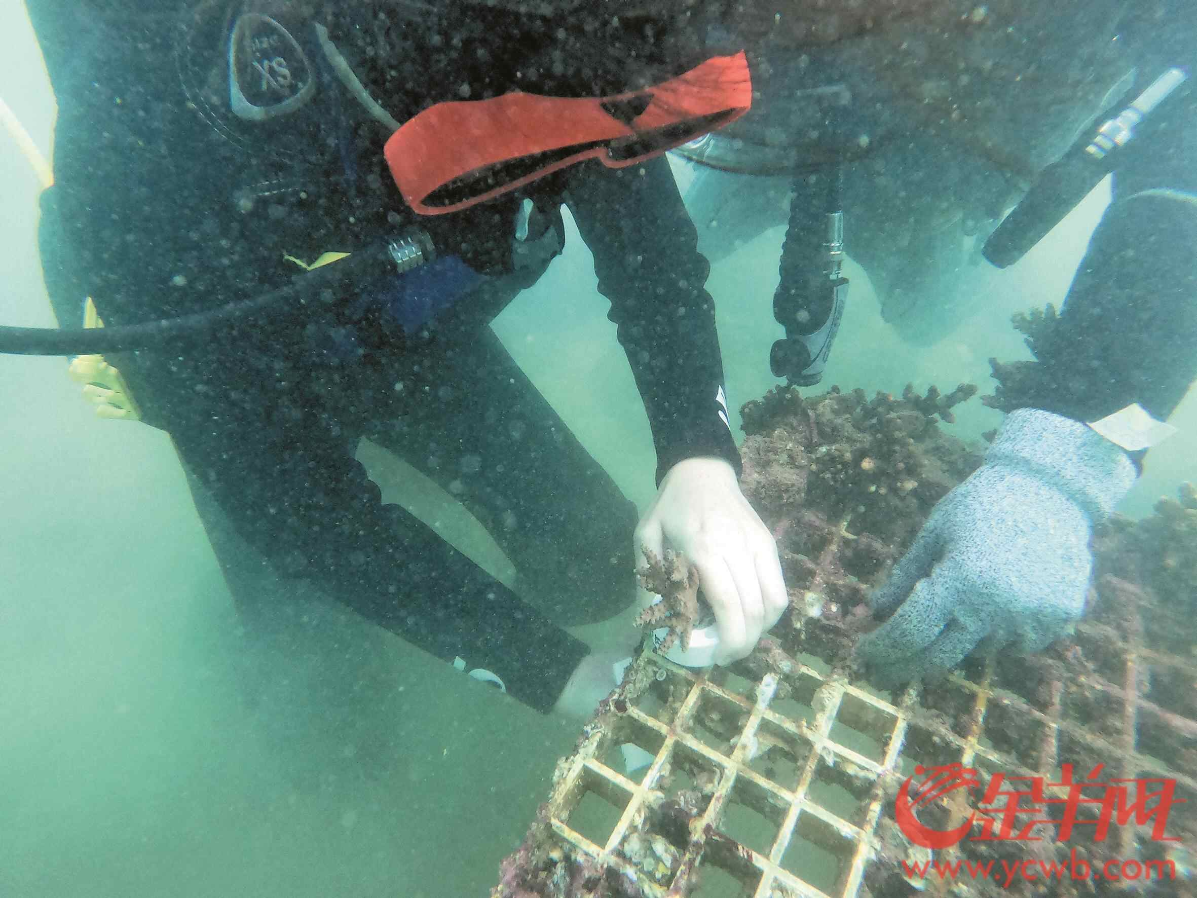 在潜水员的带领下,记者带上珊瑚,一一换装、佩戴潜水镜、背上氧气罐,潜入海水中。在指定位置,记者看到了被科研人员称为“珊瑚幼儿园”的支架。将带着珊瑚“宝宝”的陶瓷“螺母”通过“螺帽”扣在网格支架上后,珊瑚种植的过程就完成了。