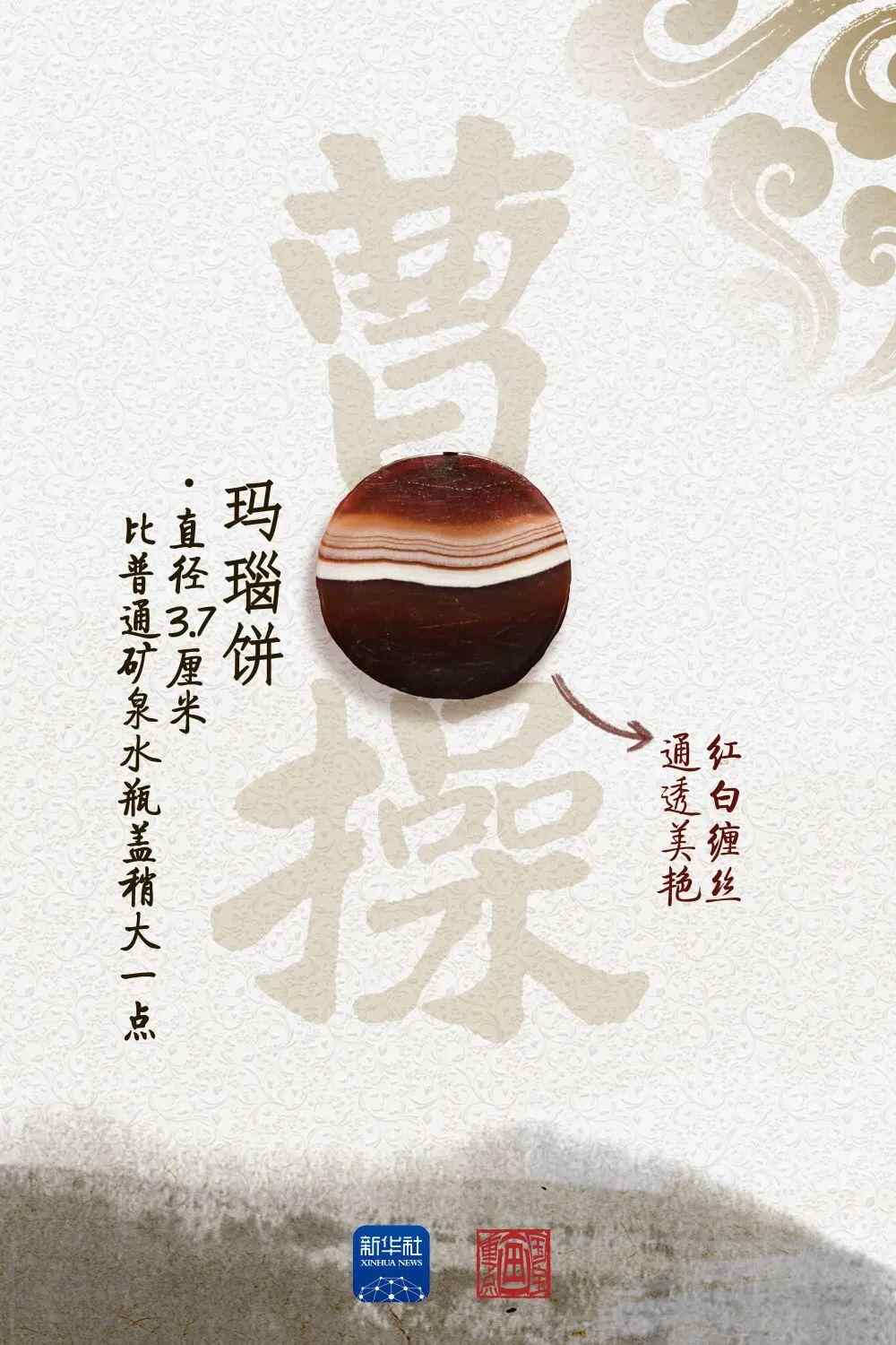 孔德铭馆长介绍,其中一件由红白缠丝玛瑙磨片制作而成的、中部横贯呈波浪形的白色纹带的玛瑙饼,可能是曹操生前珍爱之物。在东汉至三国时期的各墓葬中出土的玛瑙制品中,它工艺精良,也属罕见。