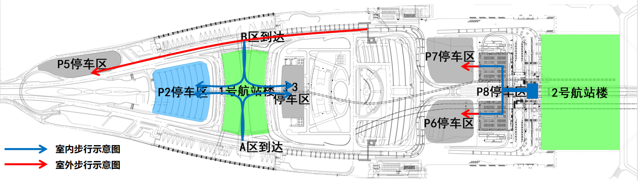 二号航站楼到达旅客可步行前往P6、P7、P8停车区上车(约3—5分钟)。