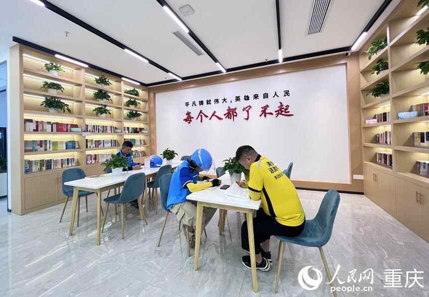外卖小哥休单的时候在巴南区新就业群体党群服务中心学习。 人民网 胡虹摄