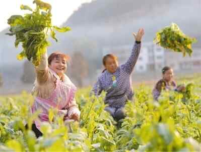 贵州省黔东南苗族侗族自治州岑巩县关庄村芥菜种植基地,村民们在采收芥菜。 胡攀学摄(人民视觉)