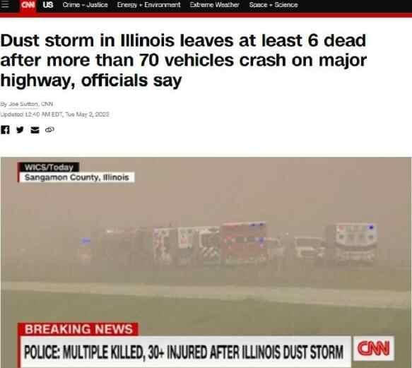 据CNN报道,当地时间5月1日,由于尘暴导致能见度降低,70余辆汽车在美国伊利诺伊州中部的一条主要公路上相撞,事故已造成至少6人死亡,37人受伤入院,伤者年龄从2岁到80岁不等。