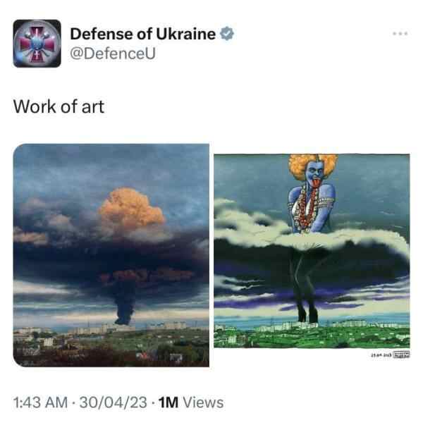 近日,乌克兰国防部在推特上发布的图片在印度引起轩然大波。这条推文中包含两张图片,第一张描绘了塞瓦斯托波尔湾一油库遭无人机袭击后升起的烟柱;另一张则是以第一张为基础创作的漫画,爆炸的浓烟中多了一名女性形象,她摆出与玛丽莲•梦露掩住裙摆相似的姿势,而这一女性形象本身又与印度教女神卡莉相似。乌克兰国防部对图片的描述是“艺术作品(work of art)”。