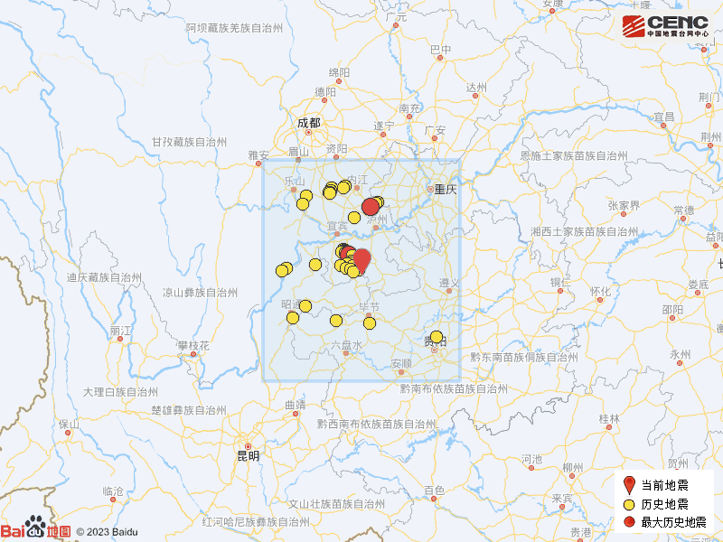 历史地震:根据中国地震台网速报目录,震中周边200公里内近5年来发生3级以上地震共283次,最大地震分别是2021年9月16日在四川泸州市泸县发生的6.0级地震(距离本次震中122公里)和2019年6月17日在四川宜宾市长宁县发生的6.0级地震(距离本次震中35公里),按震级大小前50次历史地震分布如图。