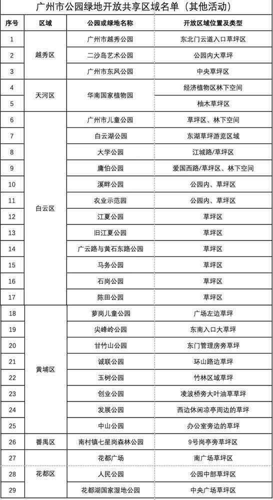 根据《名单》所示,越秀区、天河区、白云区、黄埔区、番禺区、花都区,共6个区,29个公园有绿地草坪开放,可供市民铺设野餐垫,开展休闲、游憩等户外活动。
