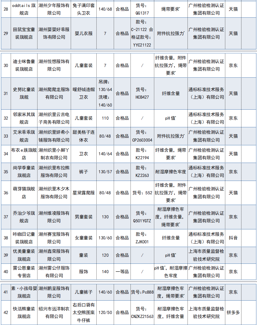发现不合格项目为甲醛含量、pH值、可分解致癌芳香胺染料、耐干摩擦色牢度、耐湿摩擦色牢度、纤维含量、附件抗拉强力、绳带要求、附件锐利性。