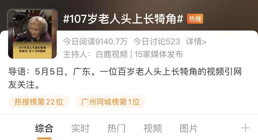 5月5日,广东一位百岁老人头上长犄角的视频引网友关注,相关话题登上同城热搜第一位。